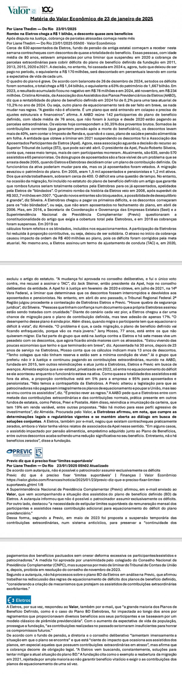 23/01/25 - Valor Econômico: Rombo na Eletros chega a R$ 1 bilhão